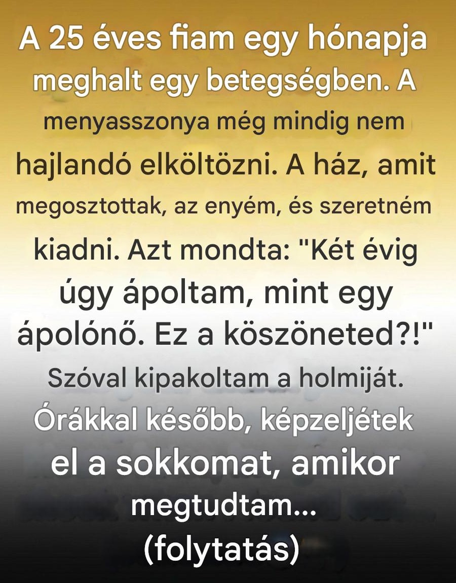 A gyász olyan módon ürített ki bennem, hogy magamra sem ismertem. A köd közepén a menyasszonya még mindig abban a házban élt, amelyben közösek voltak – egy házban, amely jogilag az enyém volt. Ki akartam adni, részben anyagi okokból, de főleg azért, mert elviselhetetlen volt elsétálni az üres szobája mellett. Amikor mondtam neki, hogy el kell mennie, vörös, álmatlan szemekkel nézett rám, és azt mondta: „Két évig úgy gondoskodtam róla, mint egy ápolónő. Tényleg ez a hálád?” Nem válaszoltam. Ehelyett inkább kitettem a holmiját. Akkoriban azt hittem, hogy védem magam. Fogalmam sem volt, hogy a bánatom miatt vak vagyok mindarra, amit csendben tett.