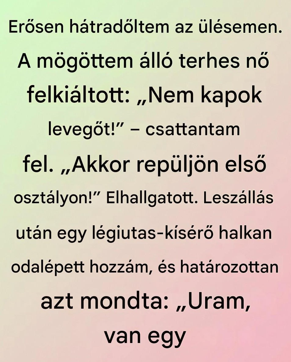 Kimerülten szálltam fel a gépre, eltökélten, hogy visszavonulok magamba, és nem veszek tudomást a körülöttem lévő világról. Aztán megláttam őt: egy terhes nő ült egy sorban mögöttem, nyugodt és nyugodt a szűkös ülések és a kabin állandó mozgása ellenére. Nem panaszkodott. Nem kért különleges bánásmódot. Mégis, pusztán azzal, hogy ott volt, tudatosította bennem, milyen kevés figyelmet szentelek bárki másnak, csak magamnak. Minden apró mozdulat, minden visszafojtott lélegzetvétel, minden néma kellemetlenség arra emlékeztetett, hogy a kényelmem nem a legfontosabb abban a térben.