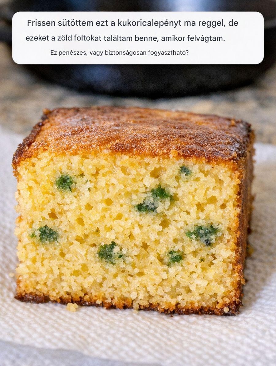 Ma reggel frissen sütöttem ezt a kukoricalepényt, de amikor felvágtam, zöld foltokat találtam benne. Ez penészes, vagy biztonságosan megehető?