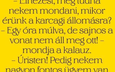 VICC: Az utasok beszélgetnek a vonaton – Elnézést, meg tudná nekem mondani, mikor érünk a karcagi állomásra? – Egy óra…