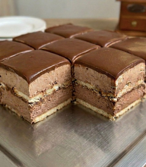 Másnap kapcsold le a keretet vagy a tepsi oldalát, óvatosan emeld le a sütiről, a kekszek mentén szépen szeletelhető, a rétegek jól összeérnek, és minden falat gazdag, krémes élményt ad. Ha jénaiban készítetted, egy szedő kanállal emelj ki egy szeletet belőle. Ezt a sütit úgy nem tudod majd szeletelni, mint egy piskótás sütit, mert sok benne a krém.