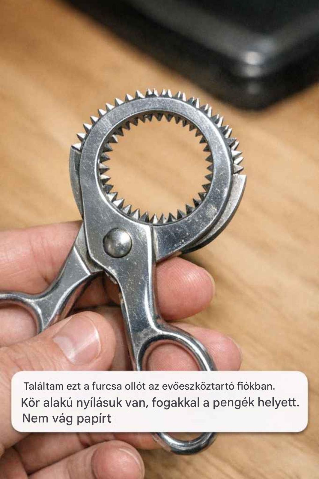 Miközben az evőeszközös fiókban turkálsz, belebotlhatsz egy különös eszközbe, ami egy ollóra hasonlít, de egy kör alakú nyílást éles vágópengék helyett fogak szegélyeznek. Első pillantásra talán zavarba ejtő a kialakítása, különösen, ha kiderül, hogy nem az olló elsődleges funkcióját látja el: a papírvágást. Ez az érdekes konyhai kütyü gyakoribb, mint gondolnád, mégis a célja sokak számára rejtély marad.